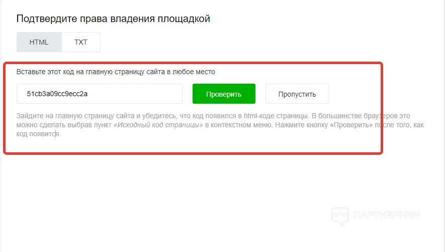 Далее останется подтвердить права на площадку и подключить счетчики. Если, например, пользователь решил указать свой сайт, то для подтверждения потребуется скопировать указанный код и разместить его на главную страницу собственного веб-ресурса в любом месте. Если же выбрана страница в ВК, то в лс придет сообщение со специальным кодом.