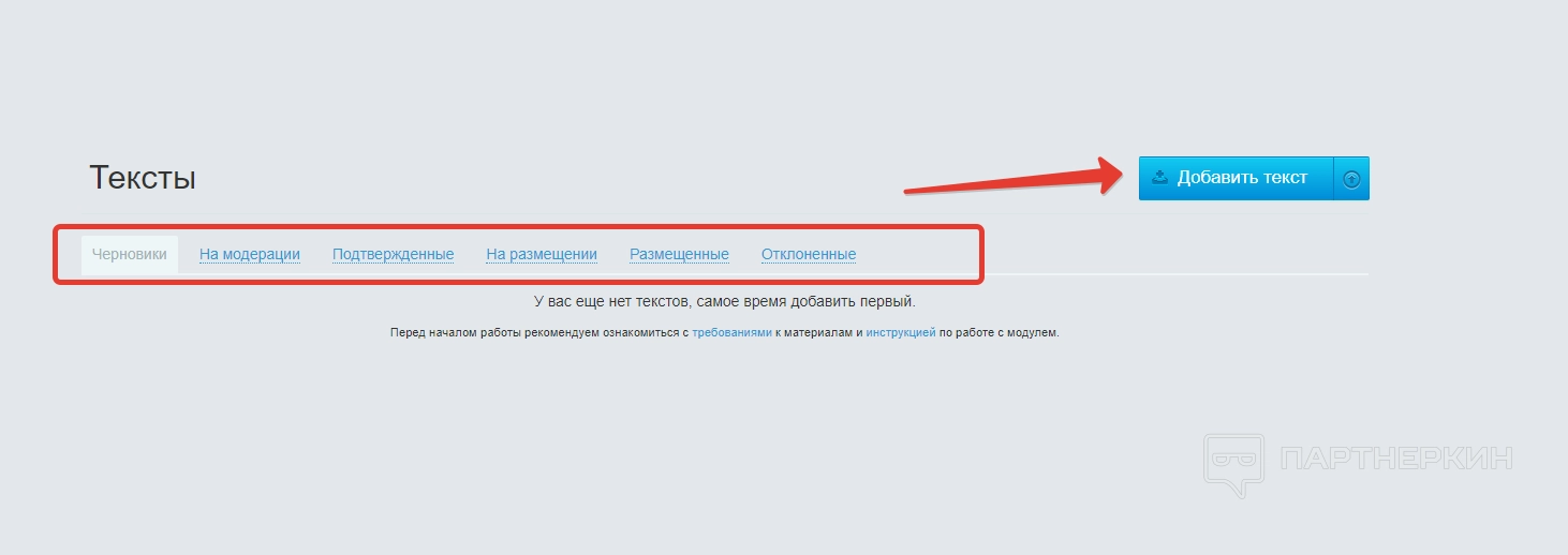 - мои тексты — в этом блоке хранятся тексты, которые будут использоваться для заработка при размещении;
