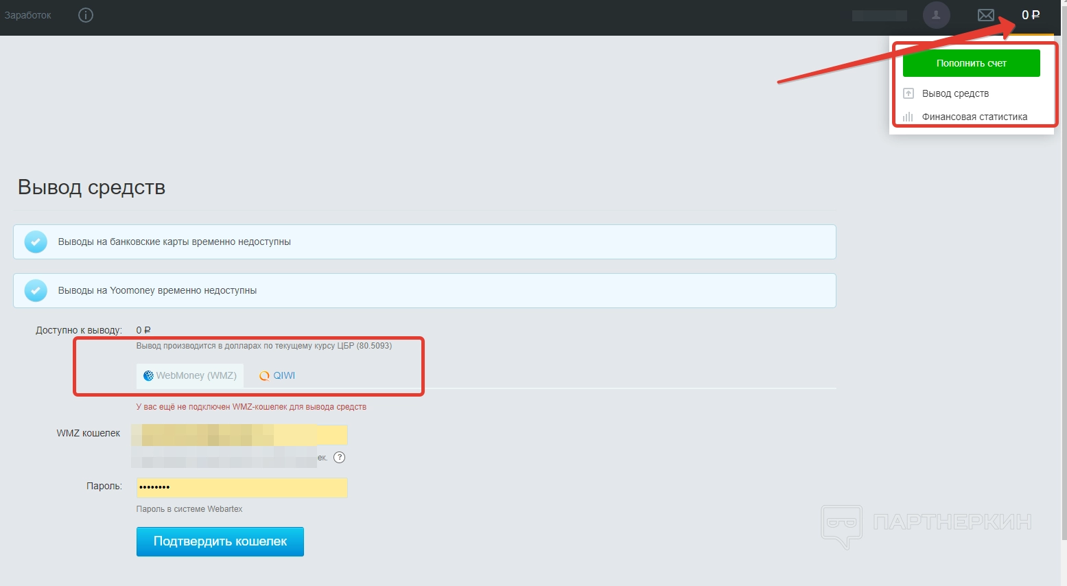 Чтобы пополнить счет, кликаем на баланс, который отображен в правом верхнем углу. Тут же откроется меню, где есть соответствующая кнопка, а также команда для вывода средств и раздел финансовой статистики. На момент написания статьи вывод средств был возможен на WebMoney WMZ и Qiwi. Вывод производился в долларах по текущему курсу ЦБР.