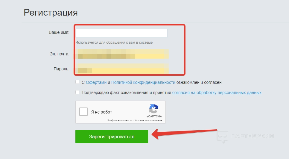Далее откроется форма, где нужно указать имя, электронную почту и пароль. По завершении соглашаемся с офертами и политикой конфиденциальности, а также разрешаем обработку персональных данных.