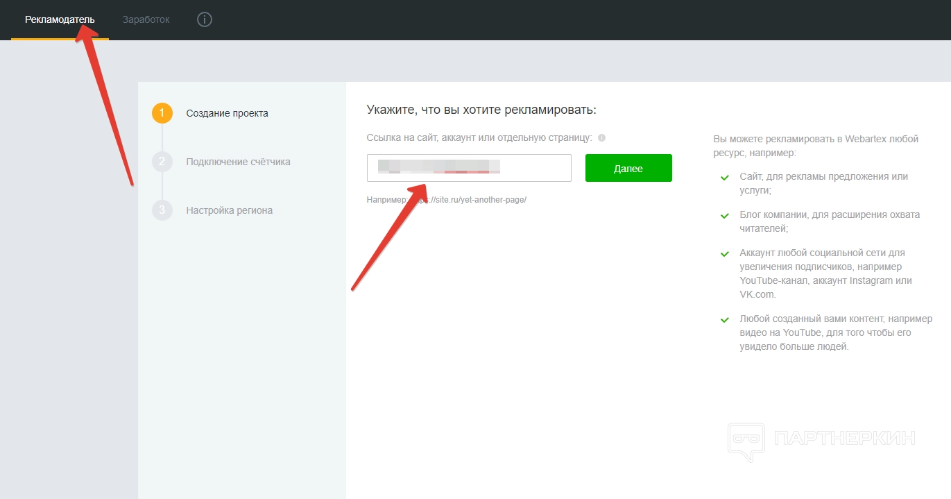 Для начала работы вебмастеру нужно настроить раздел. В первую очередь указываем ссылку на сайт, аккаунт в ВК или личную страницу. Это позволит создать проект.