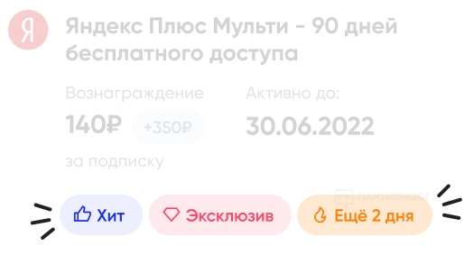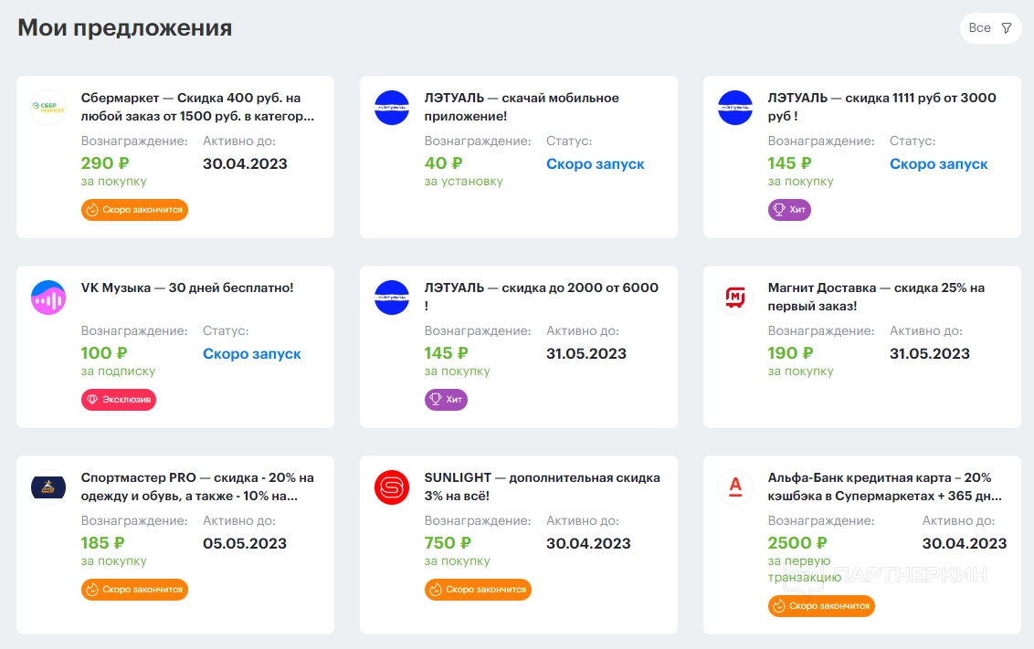 Аналогичный принцип работы проходит и с другими офферами. При этом у большинства предложений в карточках стоят специальные метки. Например:
