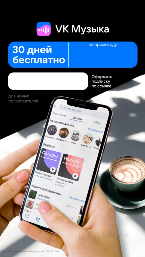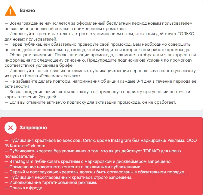 Блогер оценивает список предложений и выбирает понравившийся оффер (например, VK Музыка — 30 дней бесплатно). Инфлюенсер открывает карточку и видит следующее: