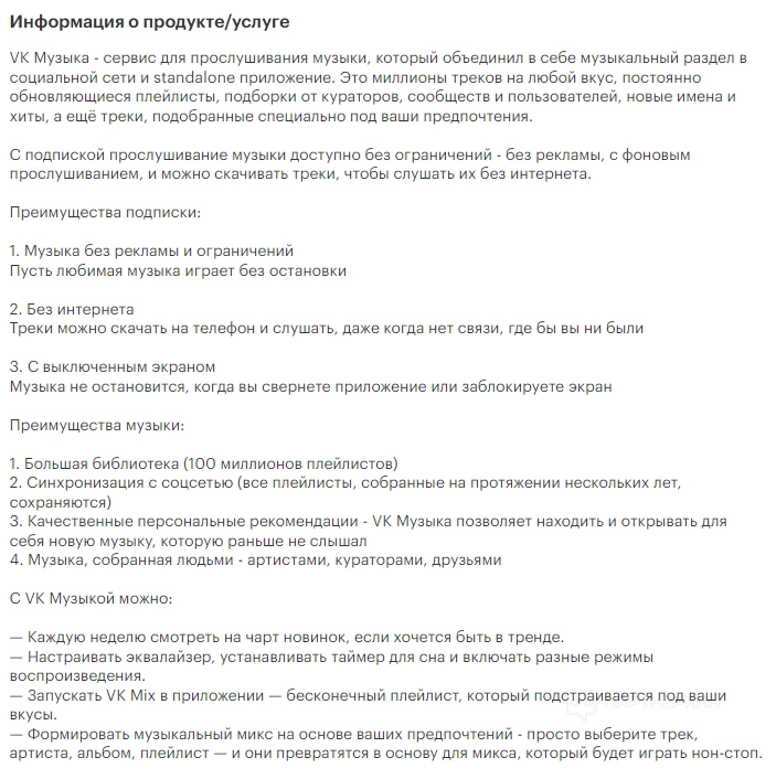 В самом низу находится подробная информация о продукте/услуге. Здесь пользователь ознакомится с преимуществами подписками и музыки, а также узнает, что можно делать с VK Музыкой.