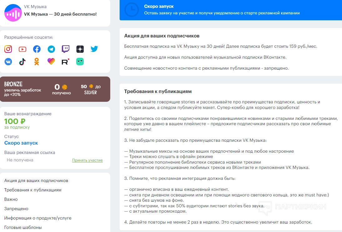 На странице сообщается суть акции для подписчиков. Также здесь представлены требования к публикациям, разрешенные социальные сети и вознаграждение блогера за подписку.