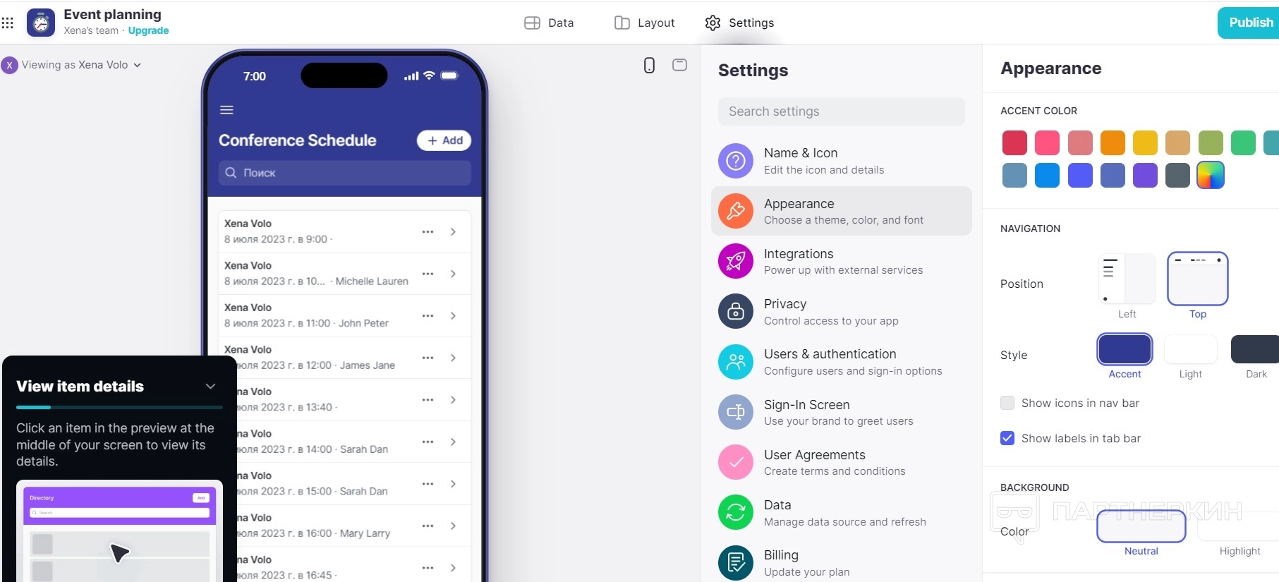 Шаг 2. Настроить. Клиент может настроить свои проекты под потребности бизнеса, выбрать и оставить только самое необходимое. Нужно перейти в область настроек. Затем можно вносить изменения в приложении и редактировать его одним щелчком мыши. Например, клиент имеет возможность сразу поменять тему, цвет, загрузить значок, управлять настройками конфиденциальности, предоставить доступ команде.