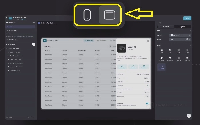 Система будет адаптировать дизайн приложения на выходе с тем, чтобы оно презентабельно выглядело на экране любого размера. Каждое приложение можно снабдить необходимыми действиями и функциями, добавляя их с помощью интуитивно-понятного интерфейса. Действия группируются в меню, что дает возможность контролировать и обновлять данные.