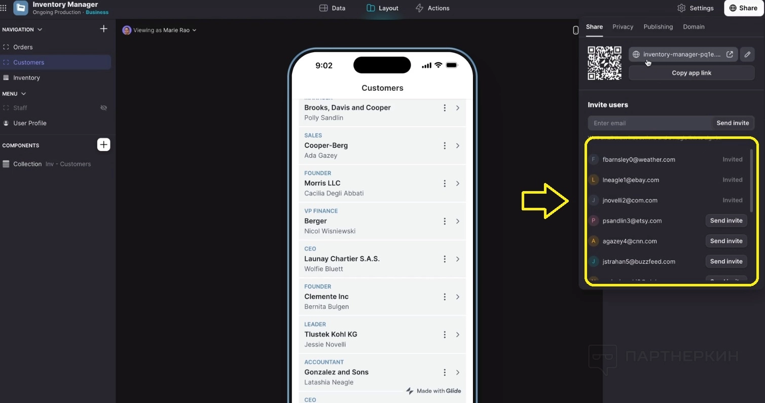Можно отсканировать QR-код телефоном, отправить ссылку самому себе или пригласить себя в приложение, чтобы получить «Волшебную ссылку». Если перейти по этой ссылке на своем телефоне, то можно увидеть приложение в браузере телефона. Есть возможность добавить его на главный экран как обычное приложение.