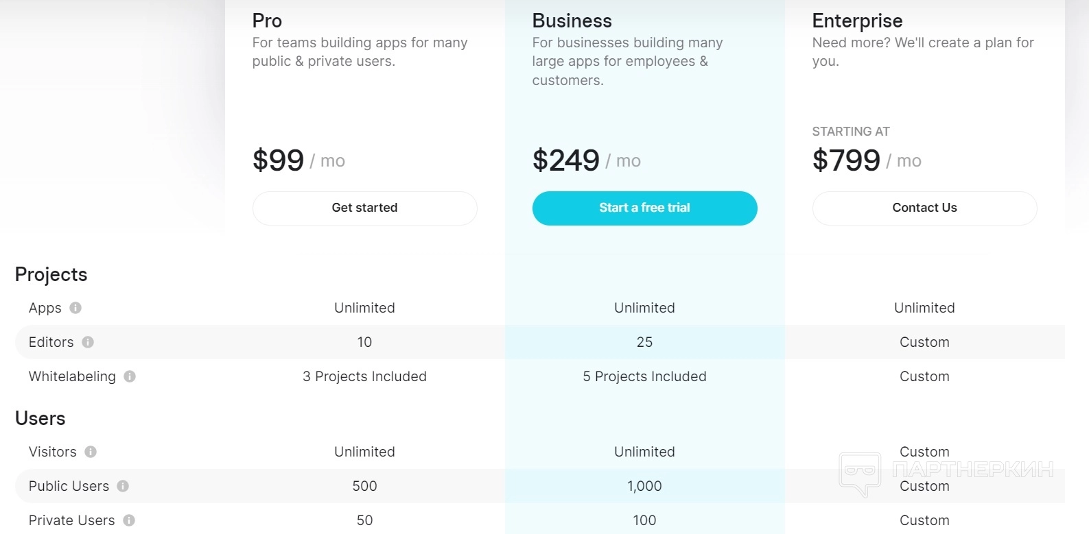 Все тарифы включают поддержку сообщества, техподдержку по электронной почте и функции: 40+ компонентов опций, 90+ типов столбцов, управление пользовательскими данными, пользовательские домены, веб-встраивания, API, защищенные столбцы, сканер штрих-кода.