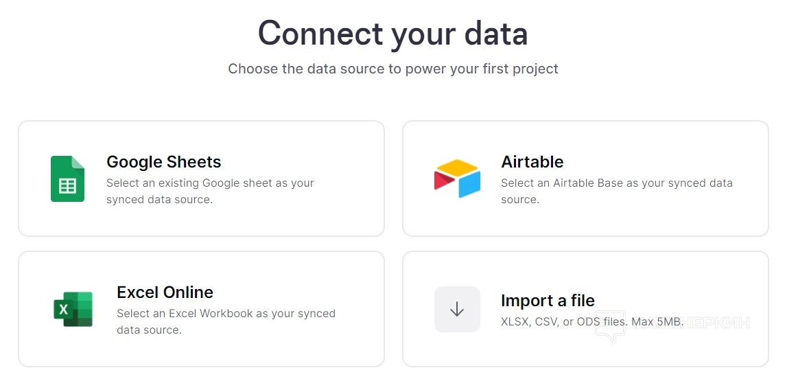 Клиент может запросить источник данных, которого пока нет, и сотрудники сервиса его подключат. Также можно импортировать сущесвтующие данные из csv или xlsx.