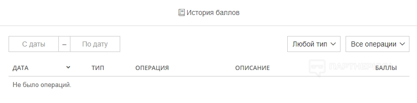 Внизу отображается история баллов: дата, тип операция, описание, количество баллов.