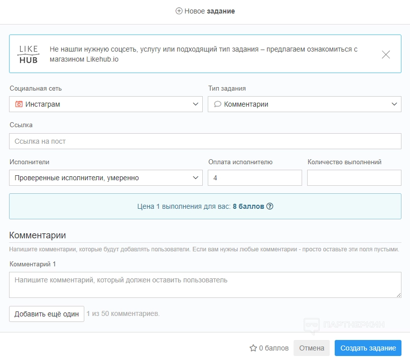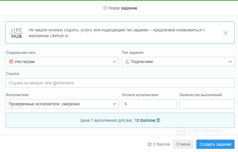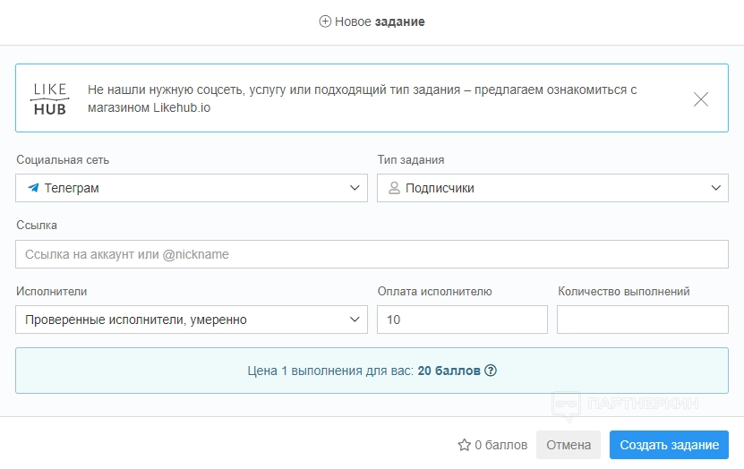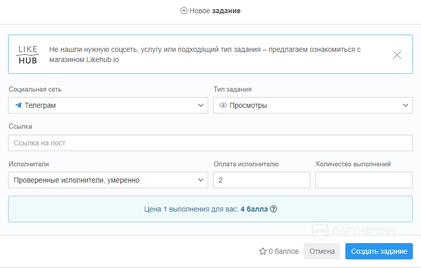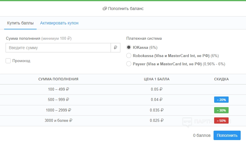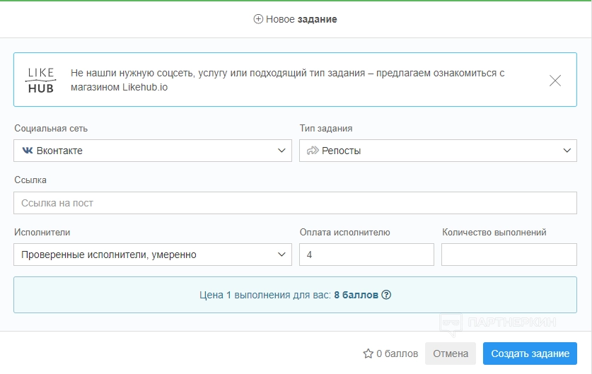 - Офферы (быстро, без редактирования). Цена: от 10 баллов. Количество: 10 — 100 000.