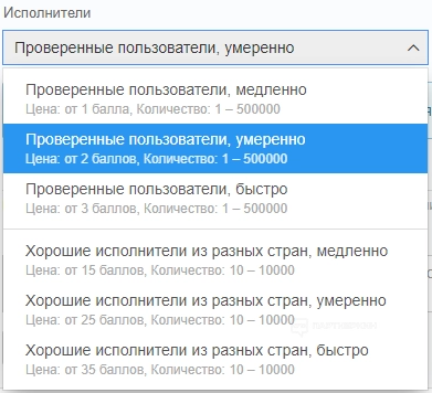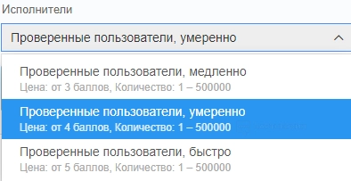 - Проверенные исполнители (умеренно). Цена: от 6 баллов. Количество: 1 — 500 000.