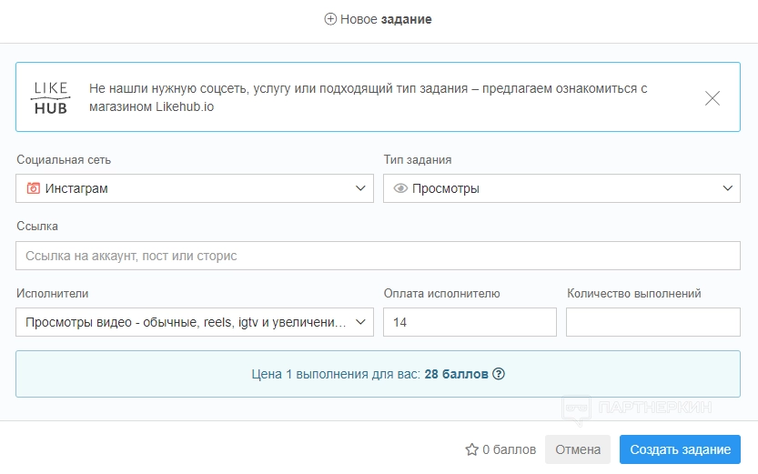 - Просмотры на любые видео — обычные, reels, igtv. Цена: от 12 баллов. Количество: 100 — 20 000.