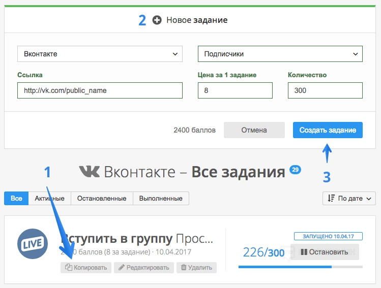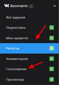 Создание заданий по накрутке подписчиков, лайков, комментариев и просмотров выглядит аналогично, как и в Instagram*. Остановимся подробнее на репостах и голосованиях.