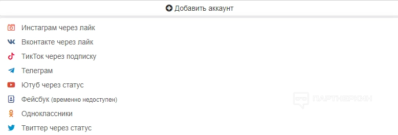 При нажатии на «Добавить аккаунт» откроется список социальных сетей: