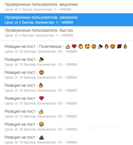 - Проверенные исполнители (медленно). Цена: от 9 баллов. Количество: 1 — 500 000.