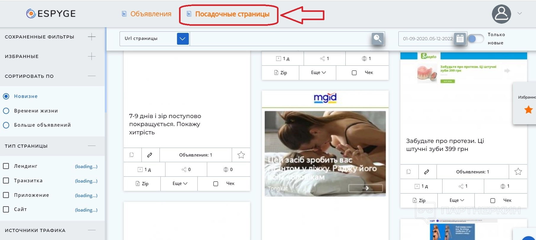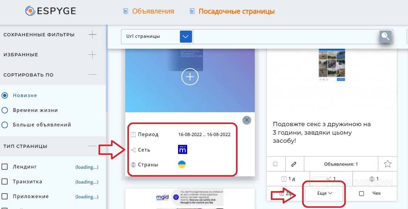 В разделе с лендингами можно фильтровать креативы по предложенным параметрам. Отсутствуют фильтры по форматам и расширениям. Добавлен фильтр по типу страницы — лендинг, транзитная страница, сайт или приложение. Можно узнать о наличии трекера.