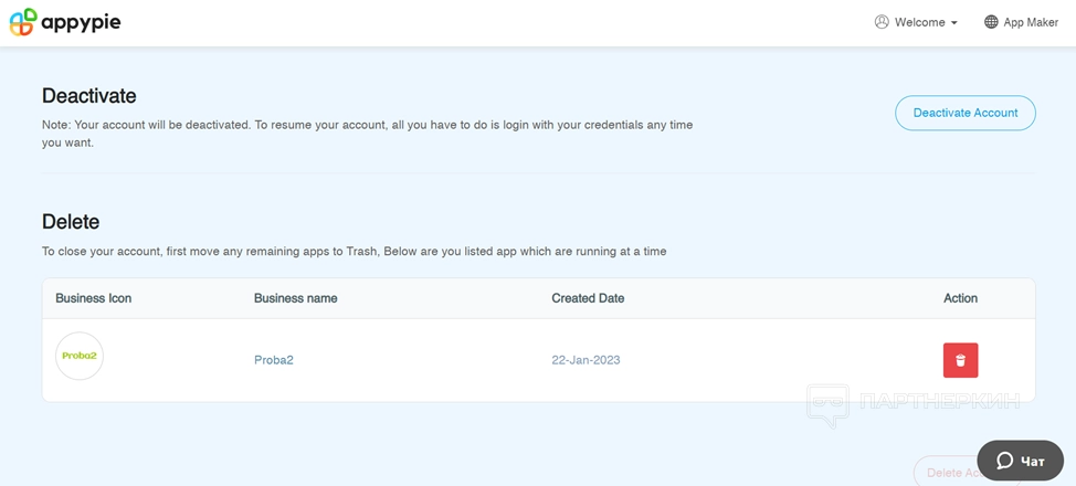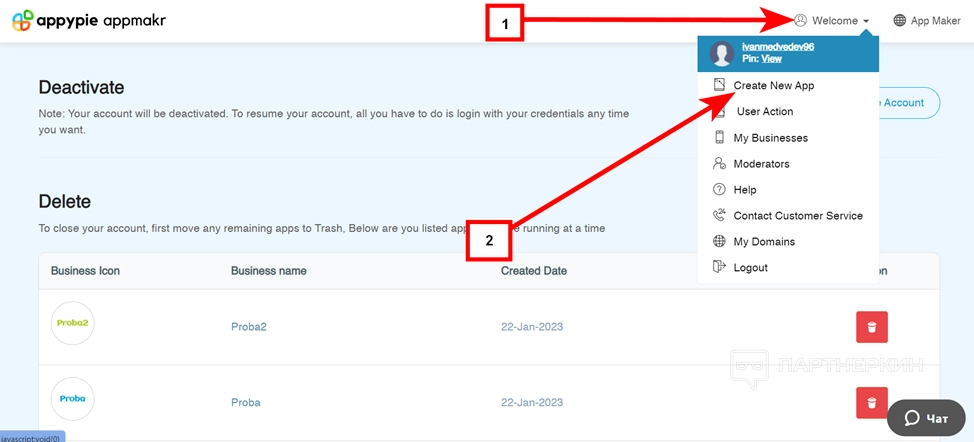 1. User Action. Управление своими проектами: редактирование и удаление приложения. Также здесь можно деактивировать свой аккаунт.