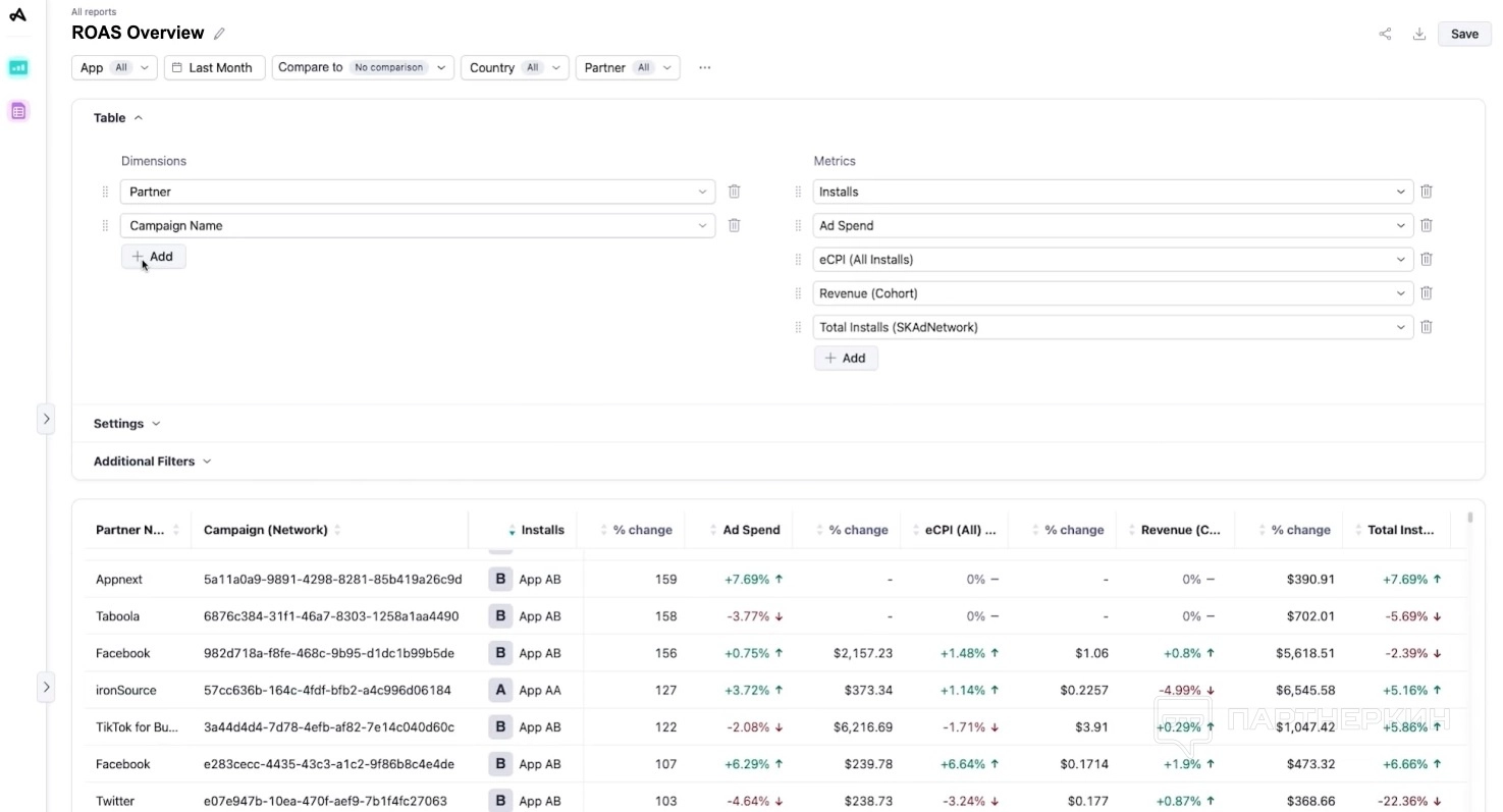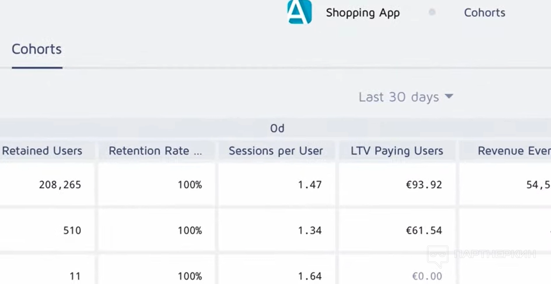- неограниченное отслеживание KPI после установки: LTV, удержание, сеансы, настраиваемые события и другие показатели;