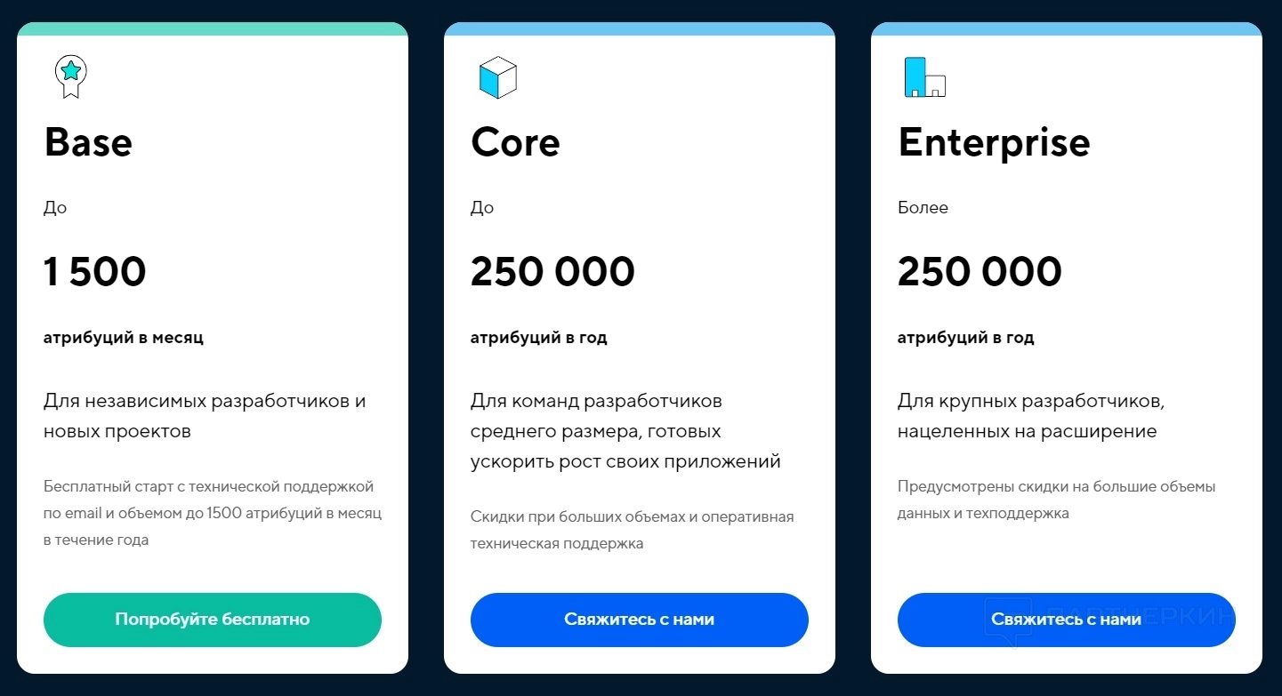 Базовая бесплатная версия включает до 1 500 атрибуций в месяц. Она подходит для небольших проектов или экспериментов независимым разработчикам. Продолжительность бесплатной версии — 1 год.