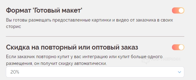 Скидка на повторный или оптовый заказ. Если заказчик повторно купит у инфлюенсера больше одного размещения, он получит скидку автоматически. В фильтре можно выбрать размер скидки — от 10 до 30%.