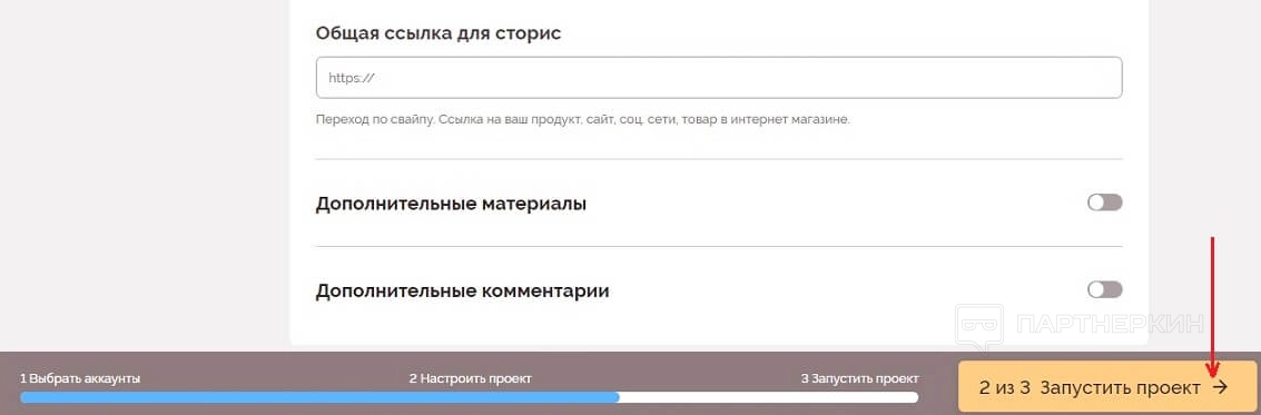 - Прикрепить ссылку на сайт или аккаунт, который необходимо показать в сторис. По желанию — загрузить дополнительные материалы. Нажать «Запустить проект».
