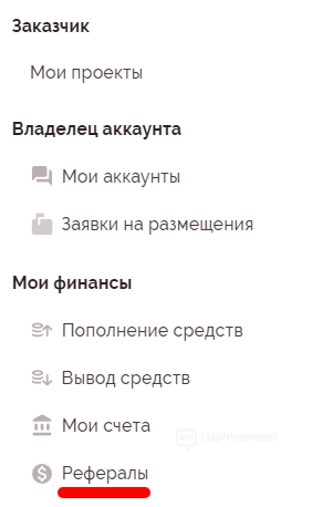2. Перейти в личный кабинет. Выбрать раздел «Мои финансы» — «Рефералы».