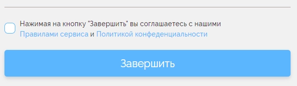 После заполнения информации необходимо согласиться с правилами сервиса и политикой конфиденциальности и нажать кнопку «Завершить».
