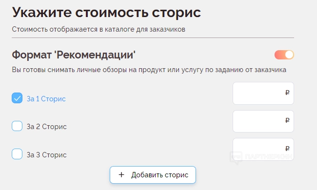 Формат «Рекомендации». Инфлюенсер готов снимать личные обзоры на продукт или услугу по заданию от заказчика. Здесь нужно указать прайс за: