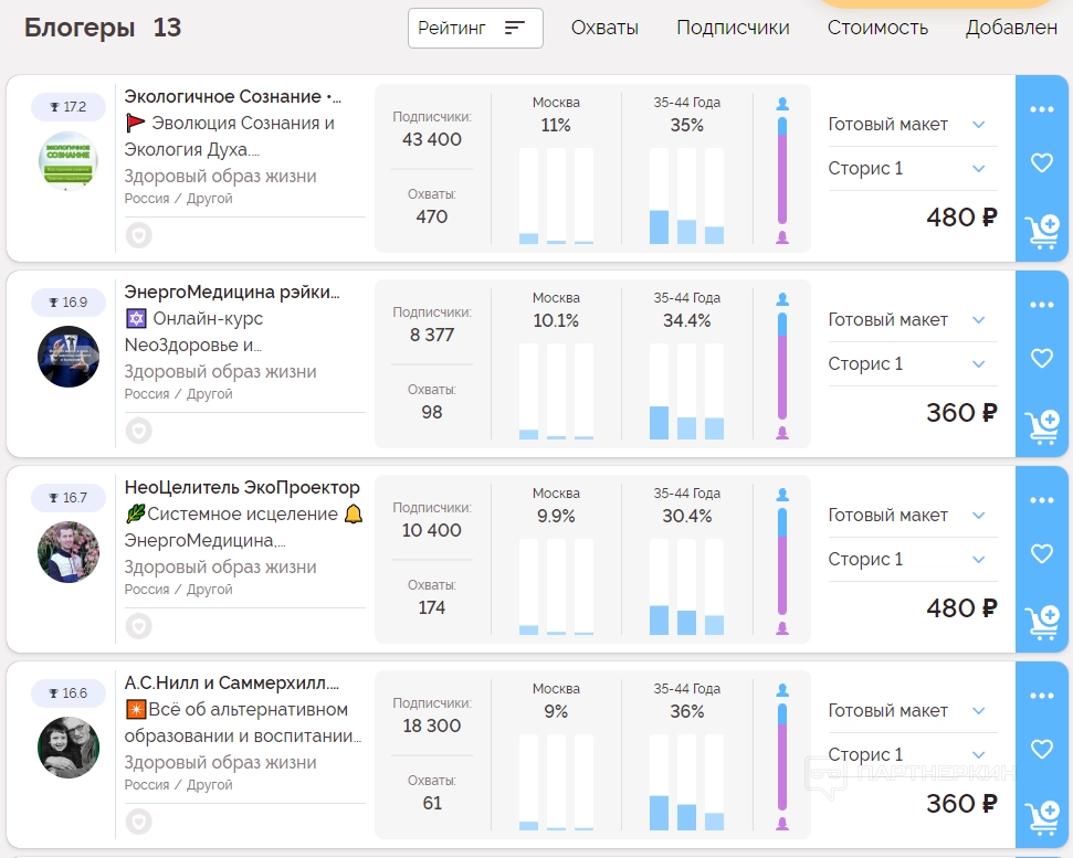 Когда заказчик настроит фильтры, в центре отобразится список блогеров, доступных для сотрудничества. Вот так выглядят инфлюенсеры из категории «Здоровый образ жизни».