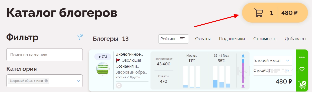 Откроется каталог блогеров. В фильтрах пользователь может использовать поиск по названию, а также выбрать подходящую категорию. Все разделы представлены в таблице.