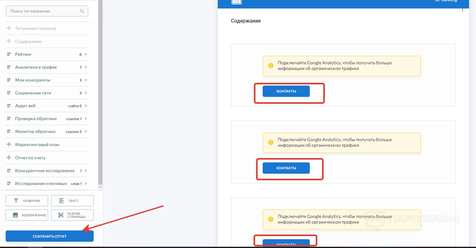 После этого подключаем Google Analytics, используя кнопку «Контакты», и ждем, пока система подгрузит данные. Когда все сведения будут готовы, спускаемся в нижний левый угол и кликаем на «Сохранить отчет».