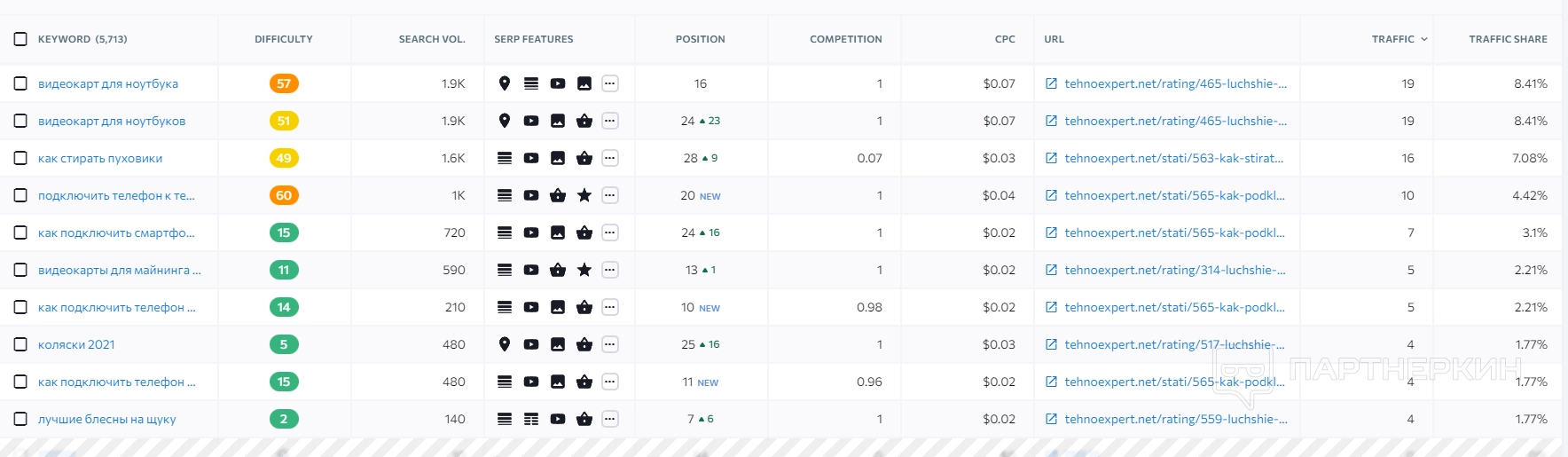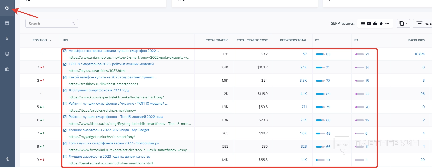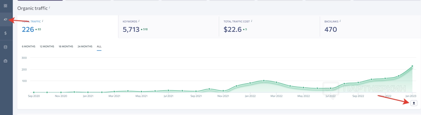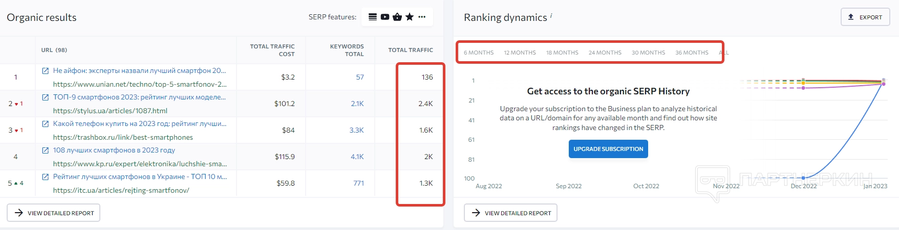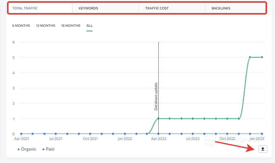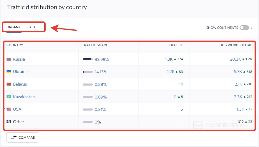 Информация отображается как по органическому, так и платежеспособному трафику. Для переключения есть соответствующий тумблер.