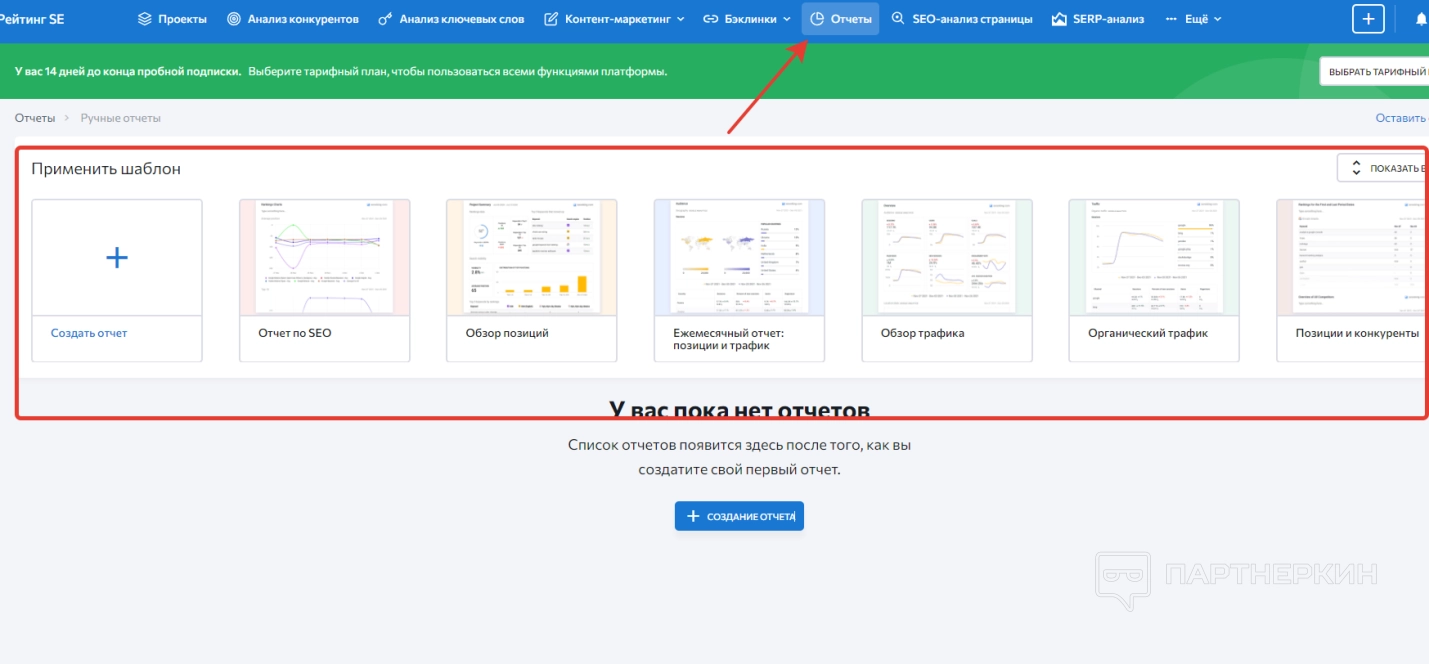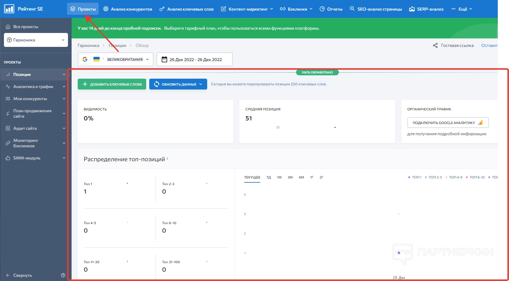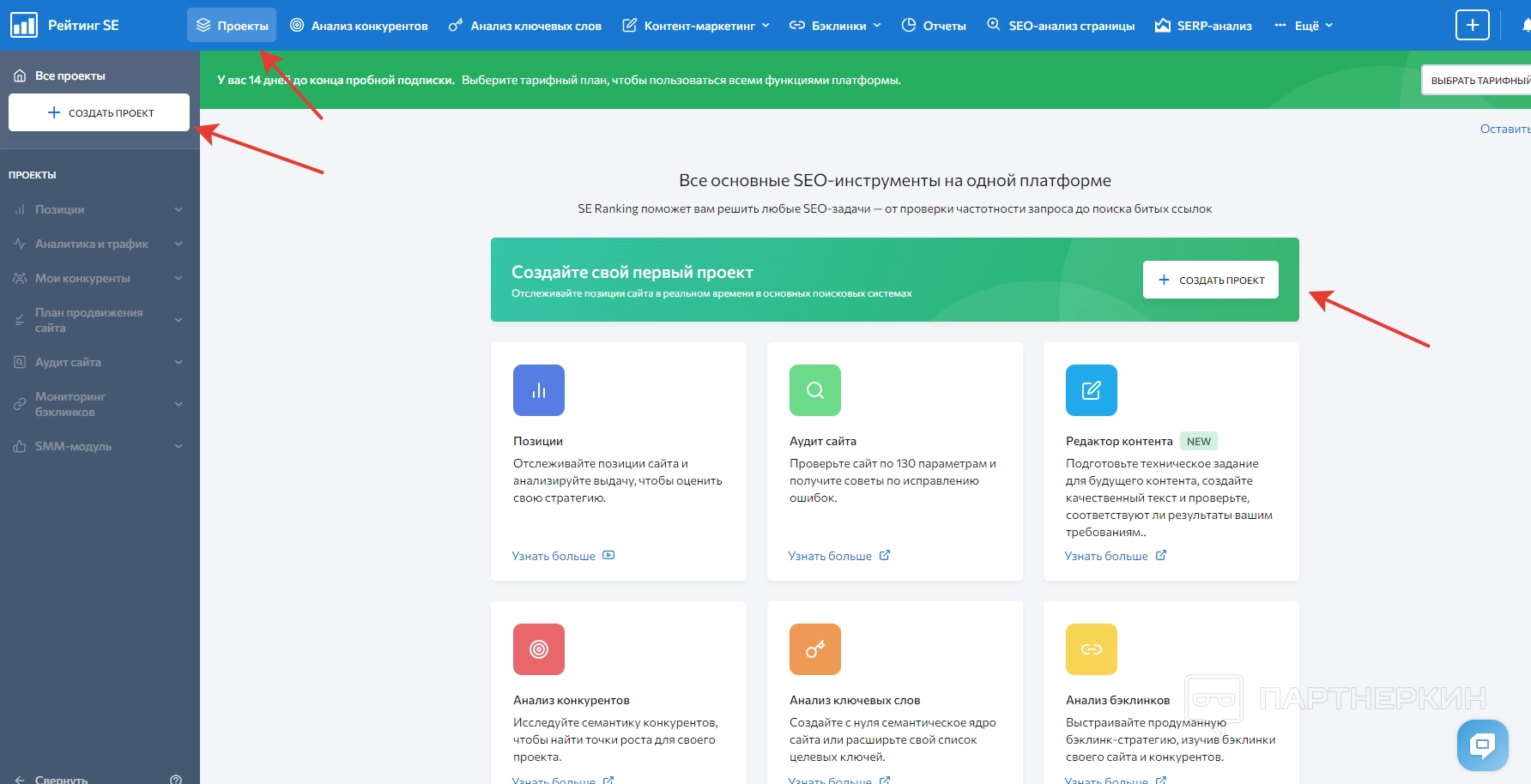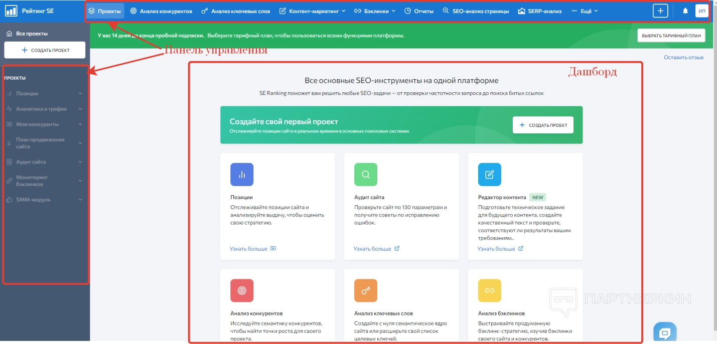 Когда пользователь войдет в зарегистрированный аккаунт, на экране появится стартовая страница, на которой будет панель управления и дашборд. Сразу обращаем внимание на надпись в верхней части экрана, где говорится об ограничениях пробного периода.