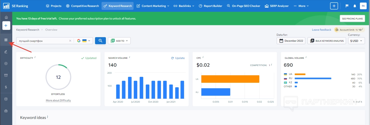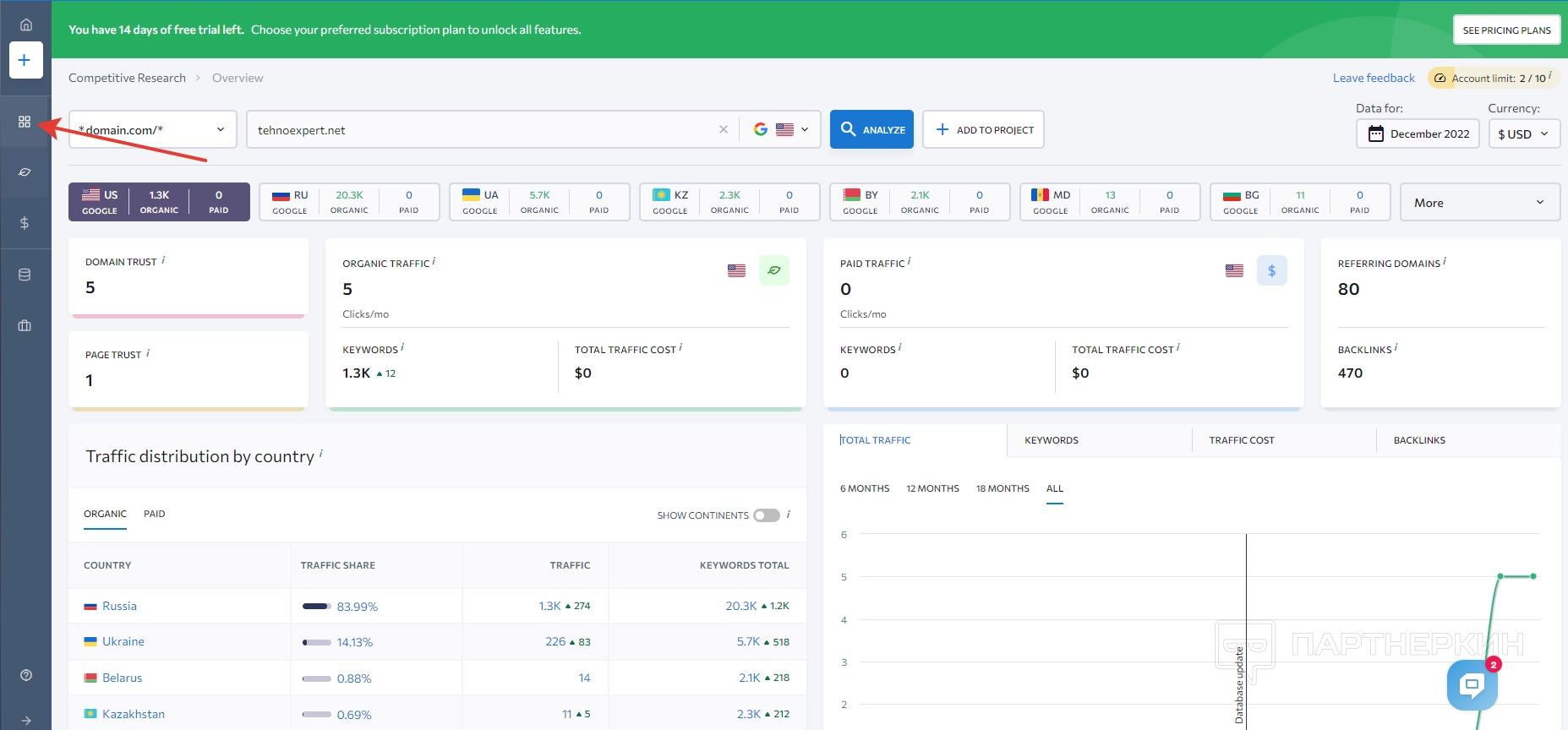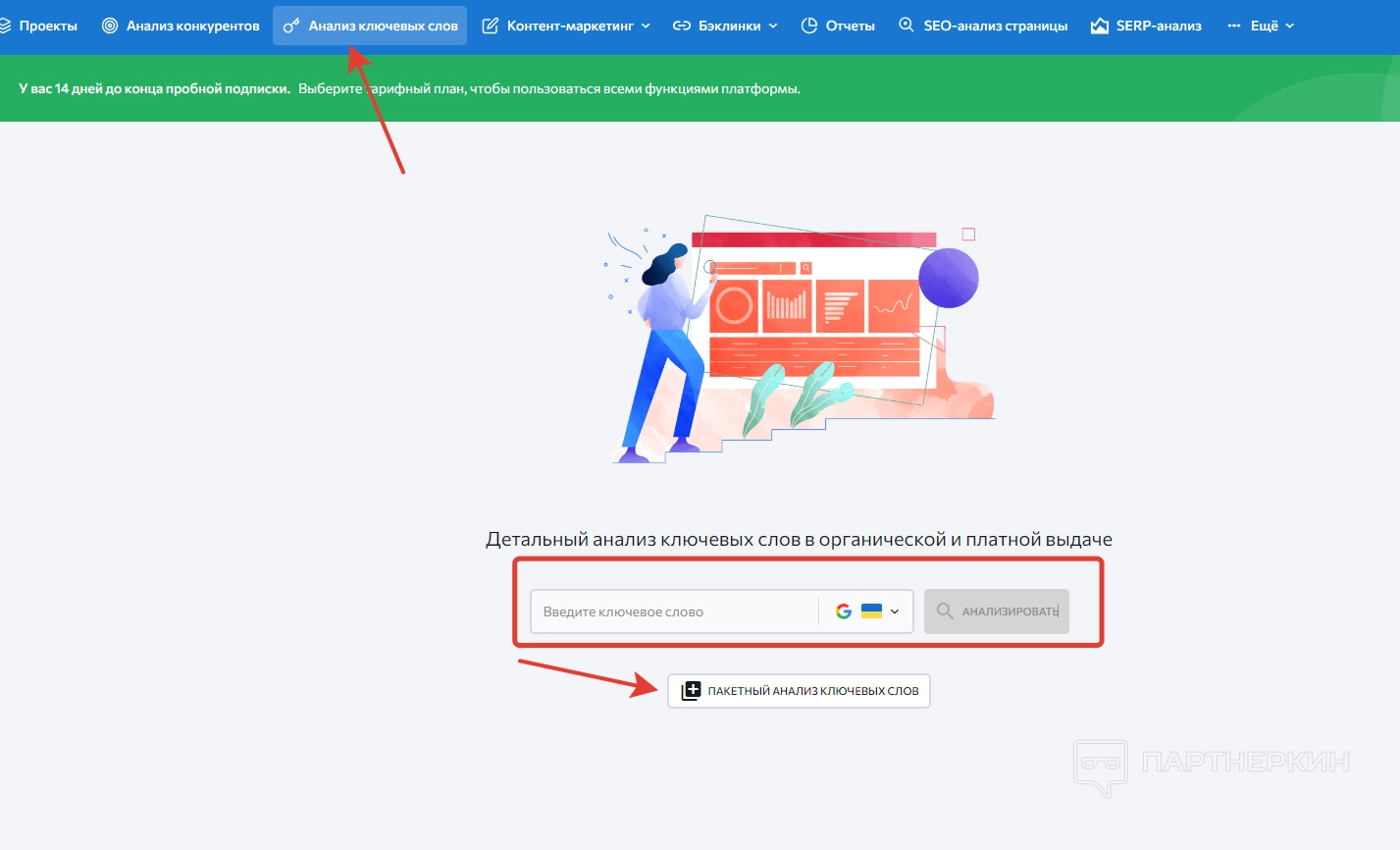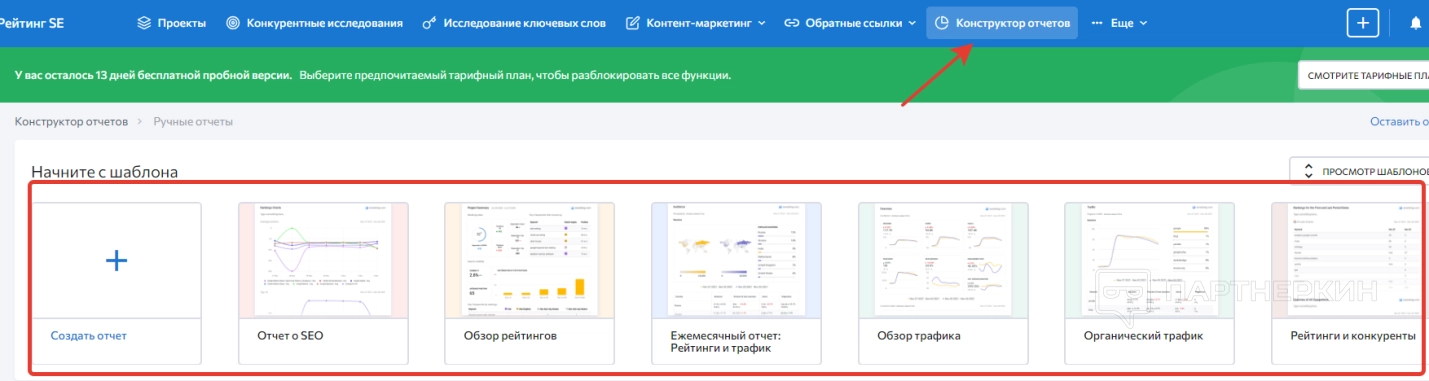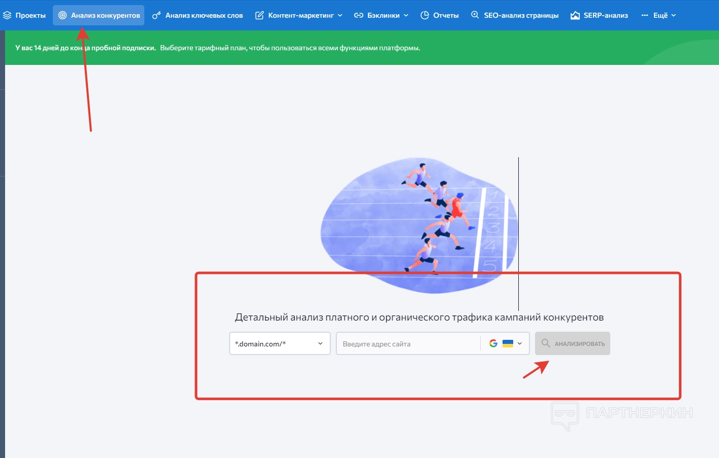 Когда пользователь войдет в зарегистрированный аккаунт, на экране появится стартовая страница, на которой будет панель управления и дашборд. Сразу обращаем внимание на надпись в верхней части экрана, где говорится об ограничениях пробного периода.