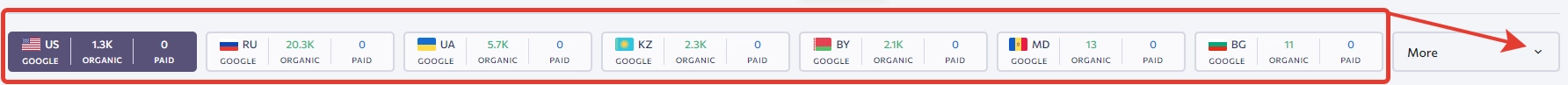 Далее идет блок, в котором отображается органический трафик по странам: США, РФ, Украина, Казахстан. С помощью специального переключателя можно выбрать и другие страны. Например: