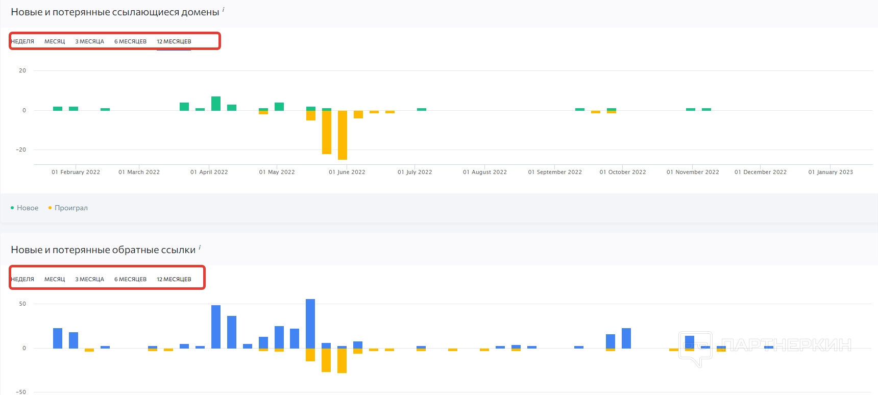 Ниже расположен блок с новыми/потерянными ссылками и доменами. Сведения здесь представлены в виде инфографики. Тоже есть возможность просматривать данные по разным промежуткам времени.