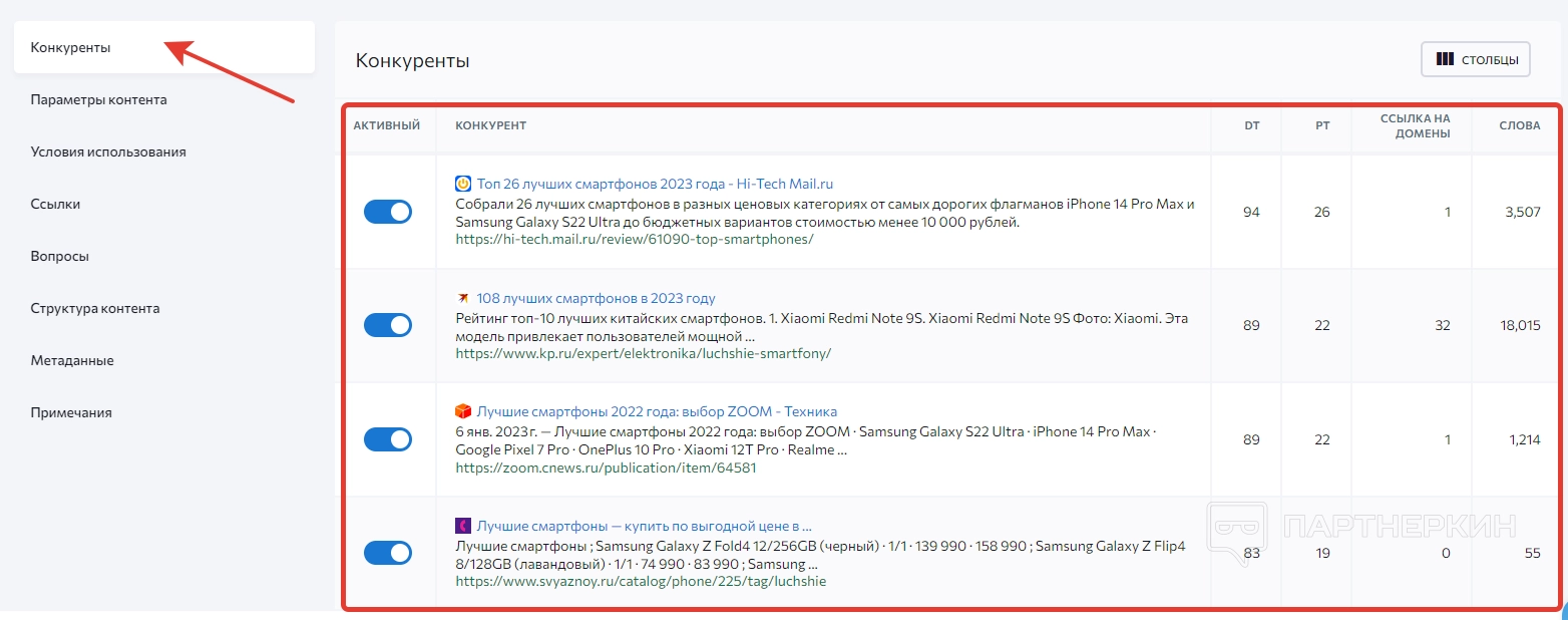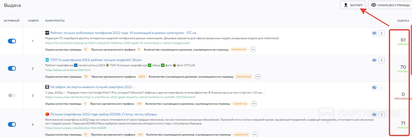В нижнее блоке «Выдача» отображаются сайты конкурентов, в которых присутствуют указанные ключи. Стоит обратить внимание на оценку контента, отображающуюся в правой части экрана. Информацию из выдачи можно экспортировать в виде Excel-таблицы.