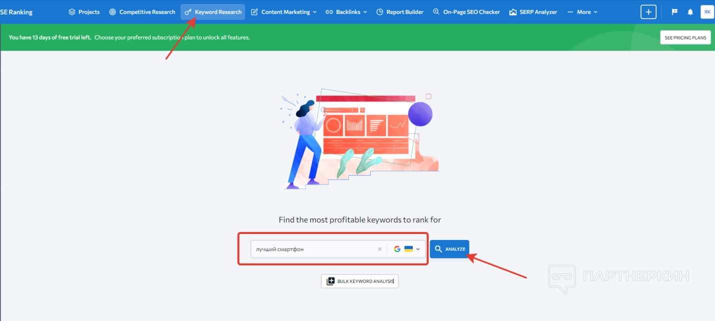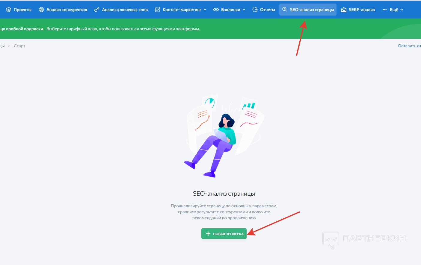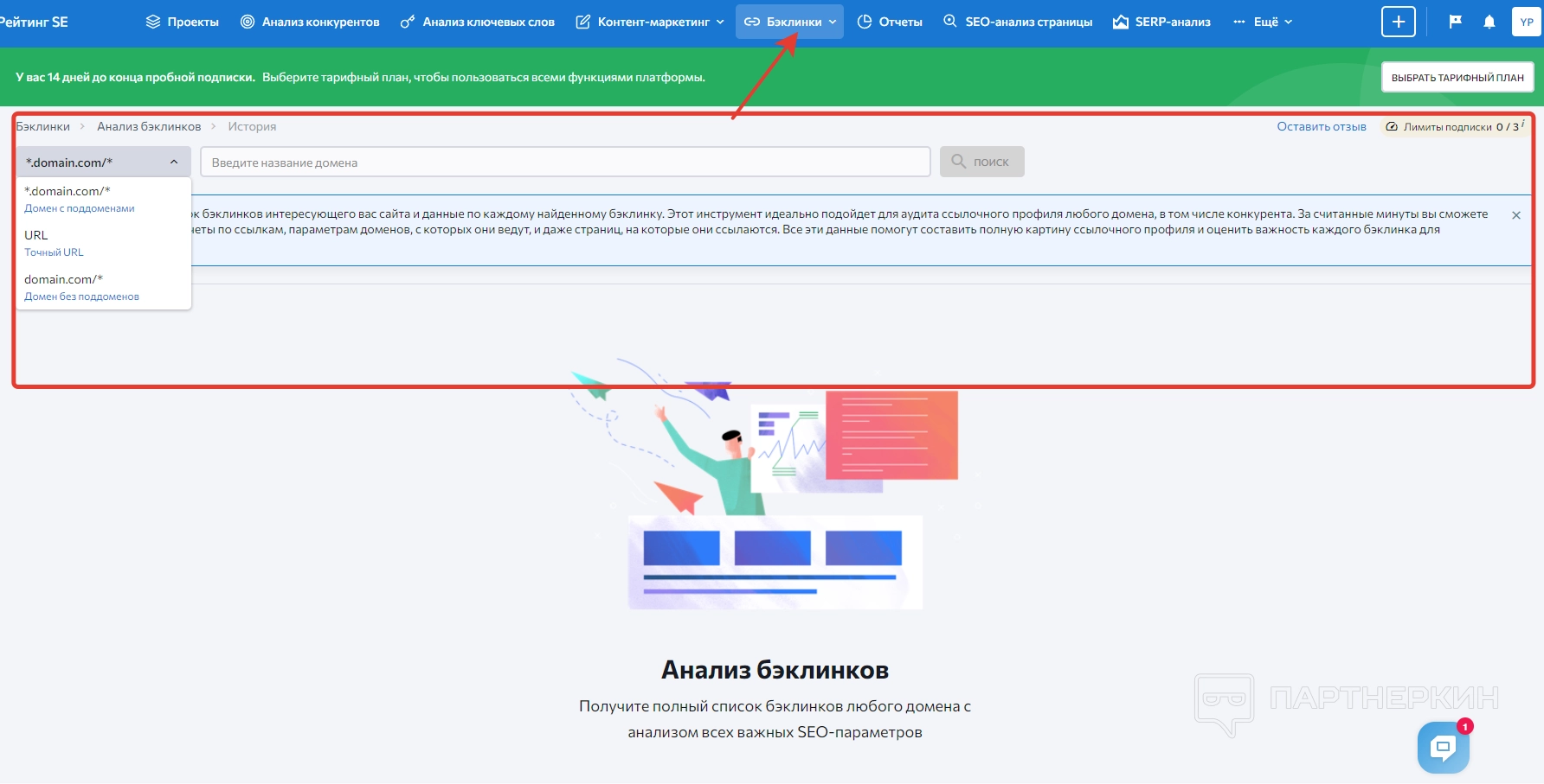 Еще один раздел, состоящий из нескольких вкладок: проверка бэклинков и анализ бэклинков. Чтобы начать проверку, заходим в соответствующий раздел и вводим URL-адрес в строку в верхней части экрана.