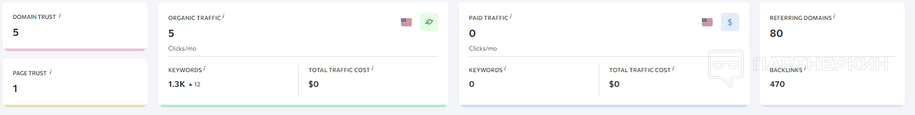 В следующем блоке отображается рейтинг домена и страниц сайта. Рядом можно найти информацию о трафике, количестве ключевых слов и заработке. В правой части раздела есть сведения по платежеспособному трафику и ключам, которые способствовали выполнению покупок. Там же находится количество бэклинков.