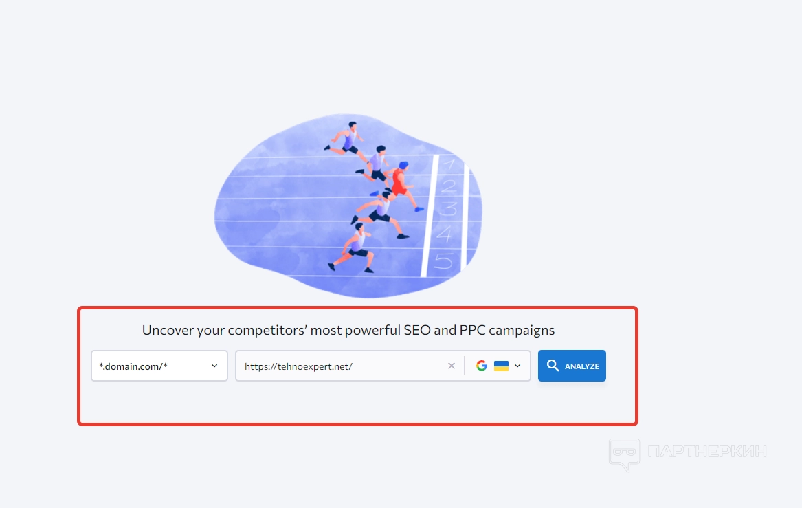 Этот раздел предназначен для изучения сайтов конкурентов, их стратегии продвижения, статистики, ключей и прочих параметров. Чтобы проанализировать веб-ресурс, необходимо добавить его в сервис. Для этого используется соответствующая форма, где можно ввести домен и выбрать ГЕО. Обращаем внимание, что искать сайты можно по доменам, субдоменам и URL-адресам. Когда выбранный ресурс будет добавлен, жмем на кнопку «Analyze» и ждем загрузки данных. Как правило, система подгружает сведения 1-3 минуты (зависит от масштаба проекта).