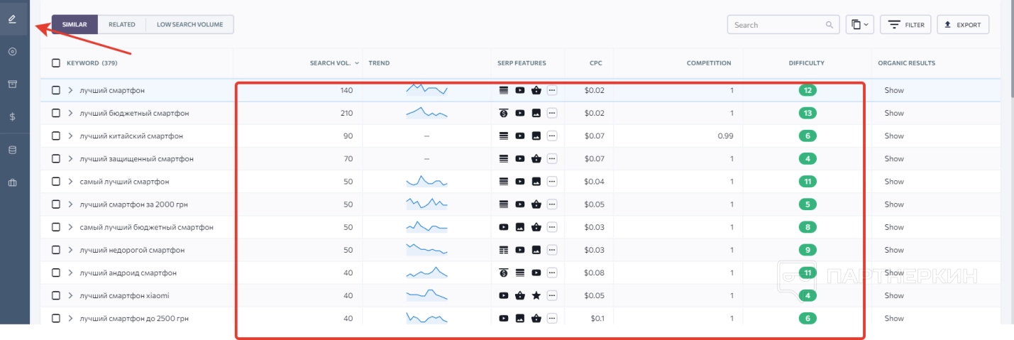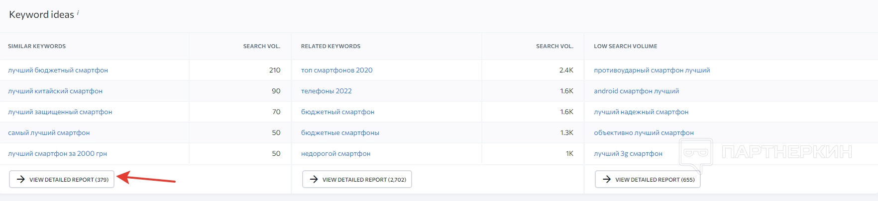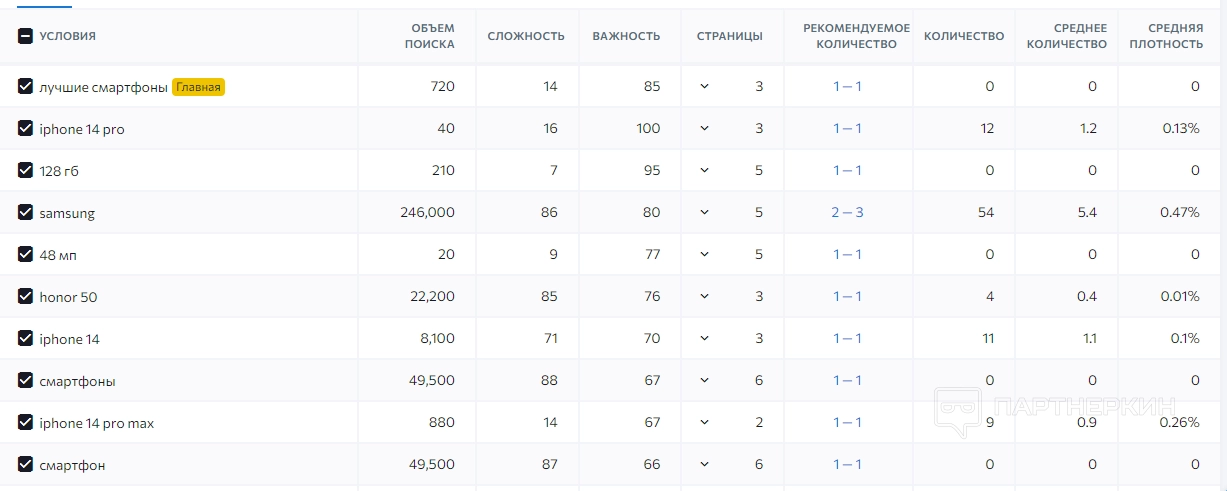 Далее идет блок с ключевыми словами, который тоже разделяется на две части. В первой можно найти сведения о ключевиках в виде таблицы. Сведения рассортированы по некоторым параметрам: