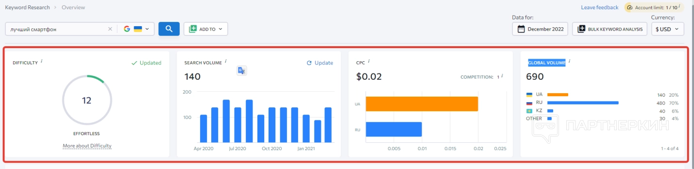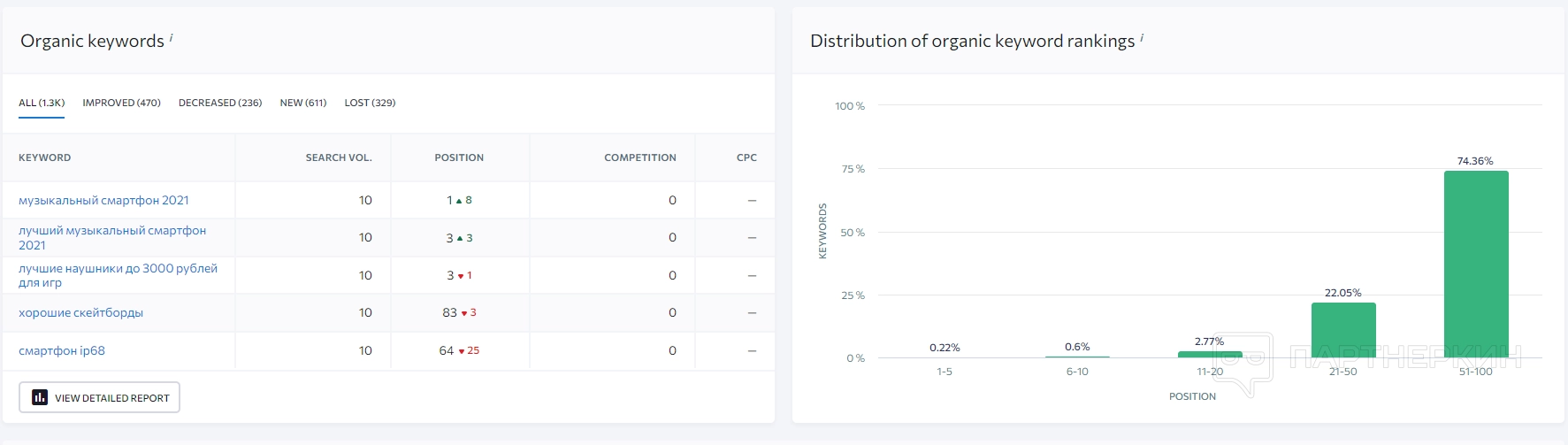 После загрузки в дашборде появится много разной информации, которая будет касаться трафика и ключей указанного сайта. Рассмотрим каждый блок интерактивного окна по отдельности.