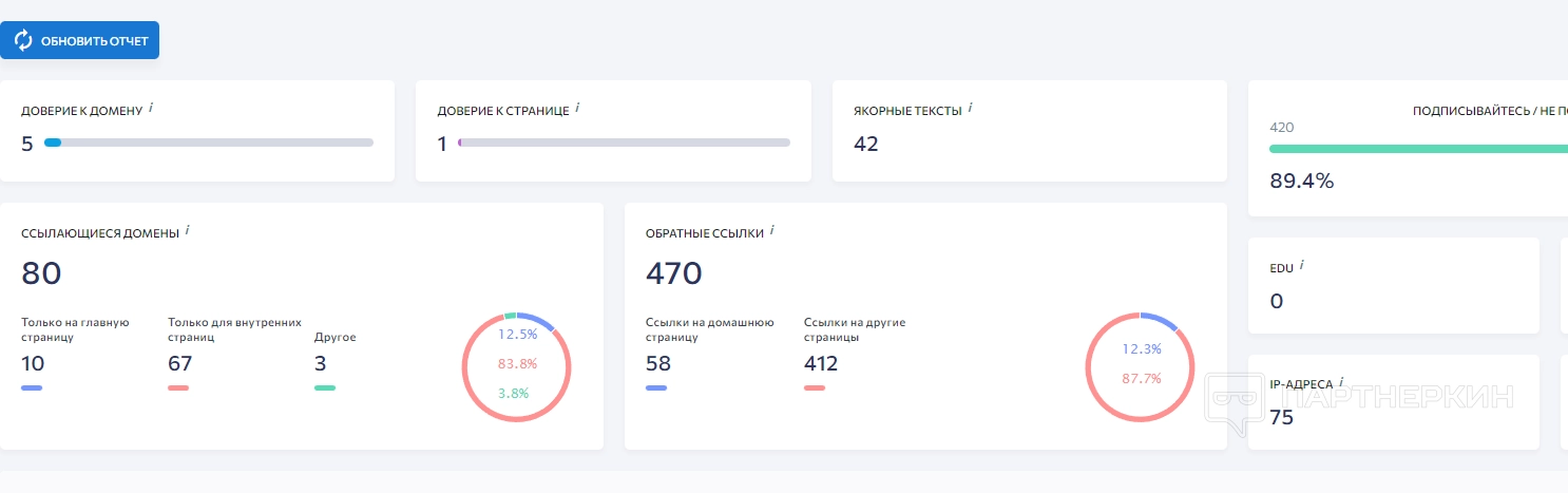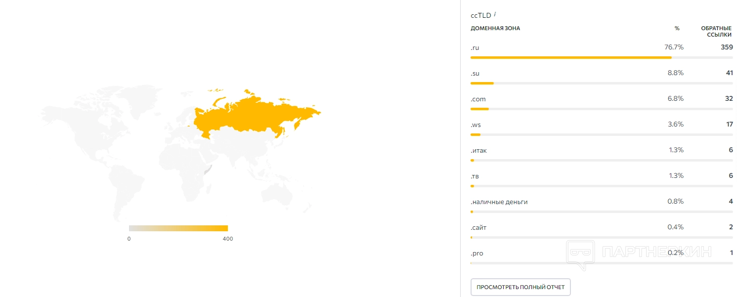 В последнем блоке пользователь найдет карту распределения доменов, а также процент и количество обратных ссылок.