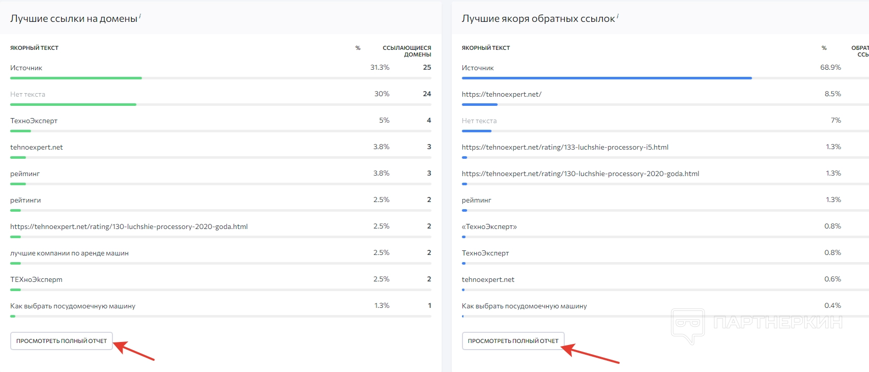 Далее можно ознакомиться с разделом, в котором отображаются лучшие ссылки на домены и якоря бэклинков. Информация показывается в процентном и количественном соотношении. Для просмотра полного отчета есть соответствующая кнопка. Однако для этого потребуется покупка подписки.