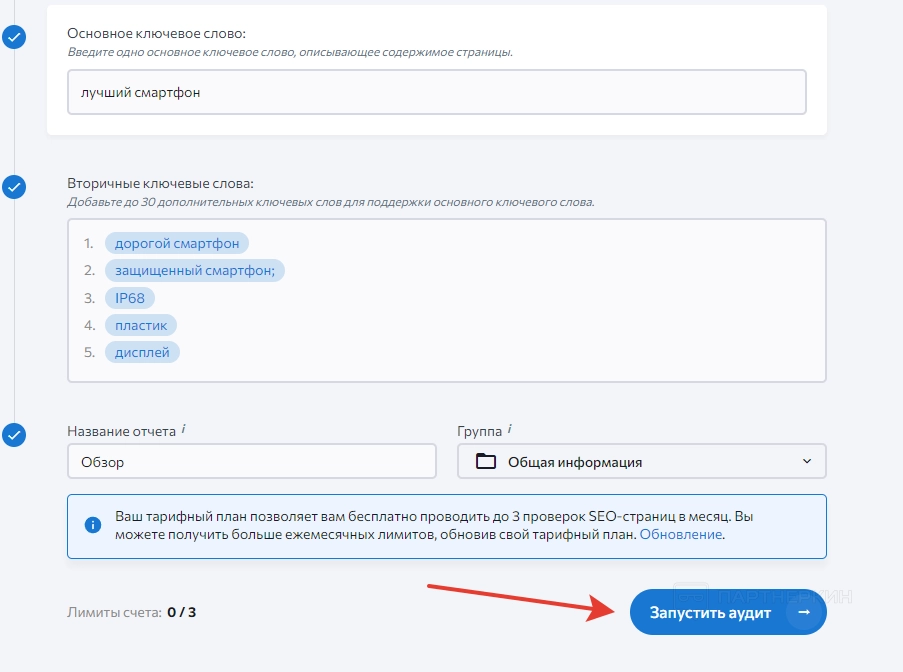 Далее указываем основное ключевое слово, дополнительные ключи и название для отчета. В конце кликаем на «Запустить аудит».