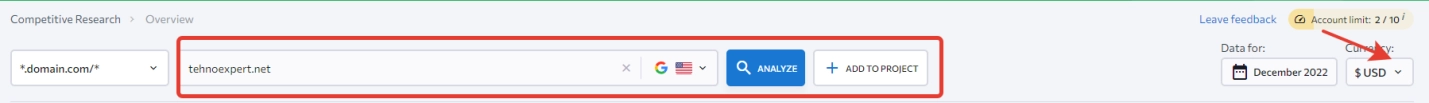 В верхней части экрана отображается введенное доменное имя параметры и кнопка для анализа. Рядом есть еще одна кнопка, с помощью которой можно подгрузить дополнительный проект для сравнения параметров. В правом углу указана дата загрузки. Рядом есть инструмент, позволяющий выбирать предпочитаемую валюту.