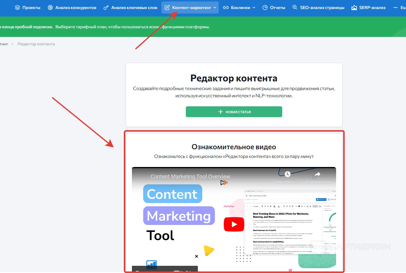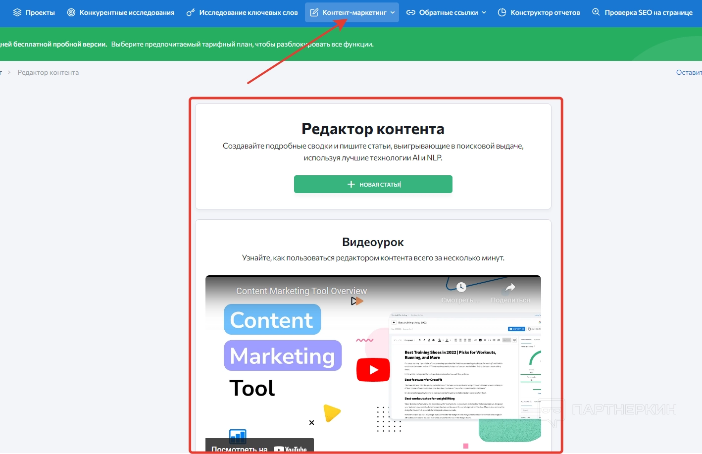 С помощью первой вкладки пользователь может составлять грамотные статьи, направленные на продвижение сайта. Помощь в этом оказывает искусственный интеллект и NLP-технологии, поддерживаемые сервисом. Чтобы ознакомиться с редактором ближе, можно просмотреть обучающий видеоролик.