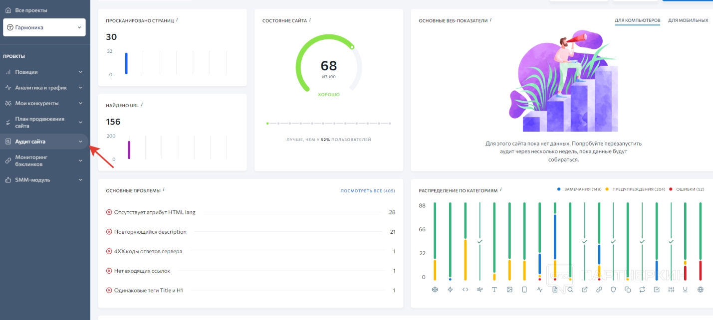 5. Аудит сайта. Здесь сервис отображает все данные, которые были получены при сканировании веб-ресурса.
